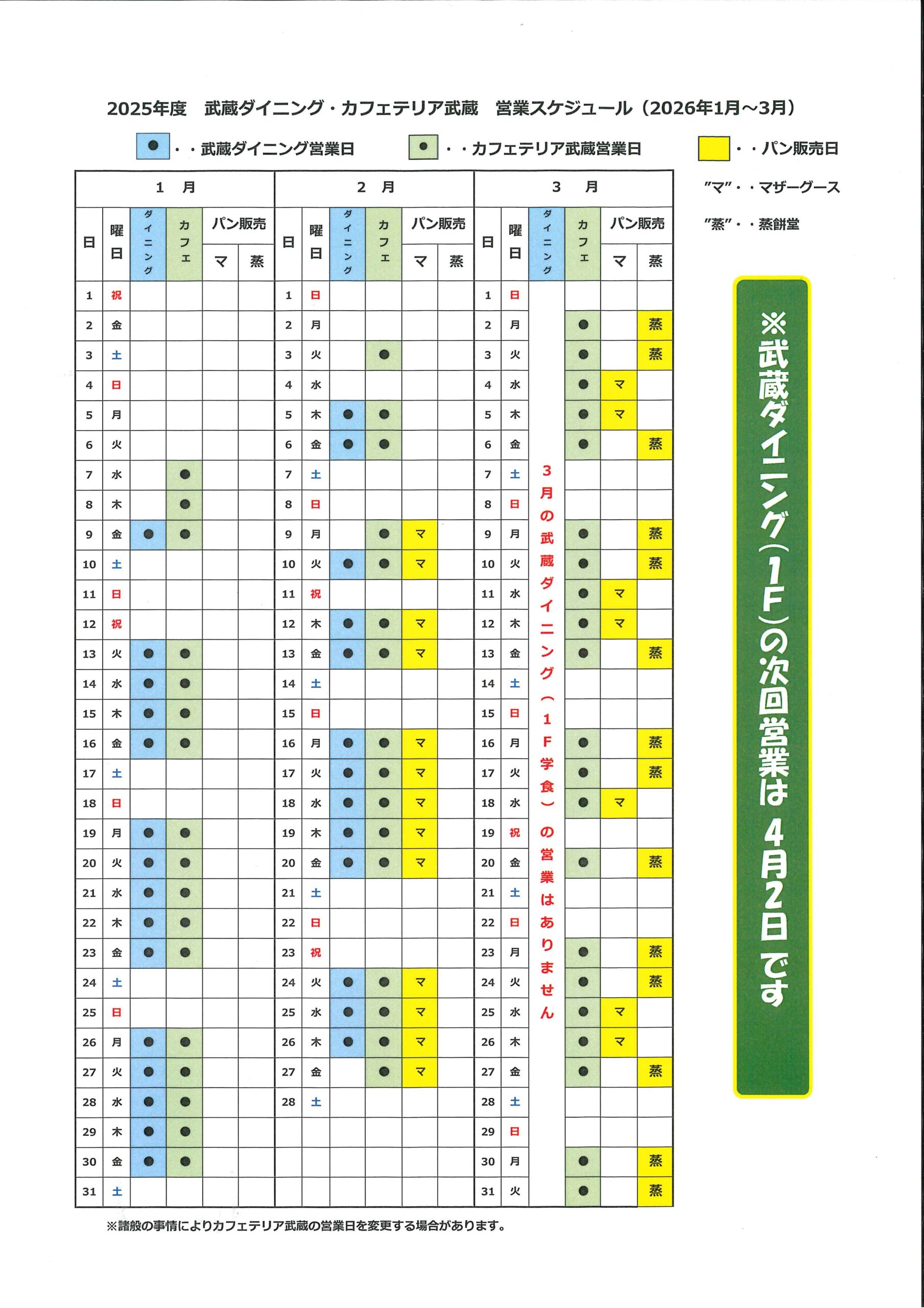 武蔵ダイニング 週間メニュー一覧